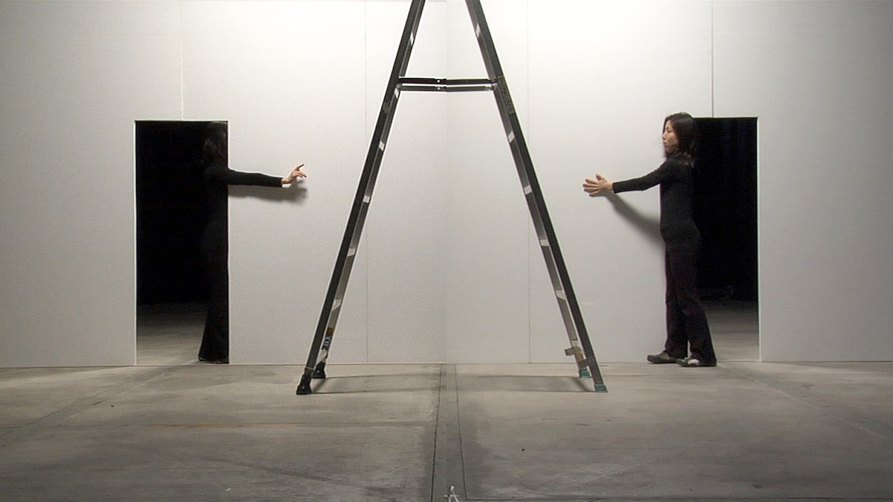 A ladder stands against the white wall. Groping for each other, two women go in and out of the two hollowed out doors. The film apparently shows the action of the two performers, but it is in fact structured in such a way that the images filmed by the two cameras positioned in front of and behind a single performer are distributed to the right and the left side of the screen. The spectator will experience a strange space through the woman performer’s doubled body, albeit existing the same space and time.